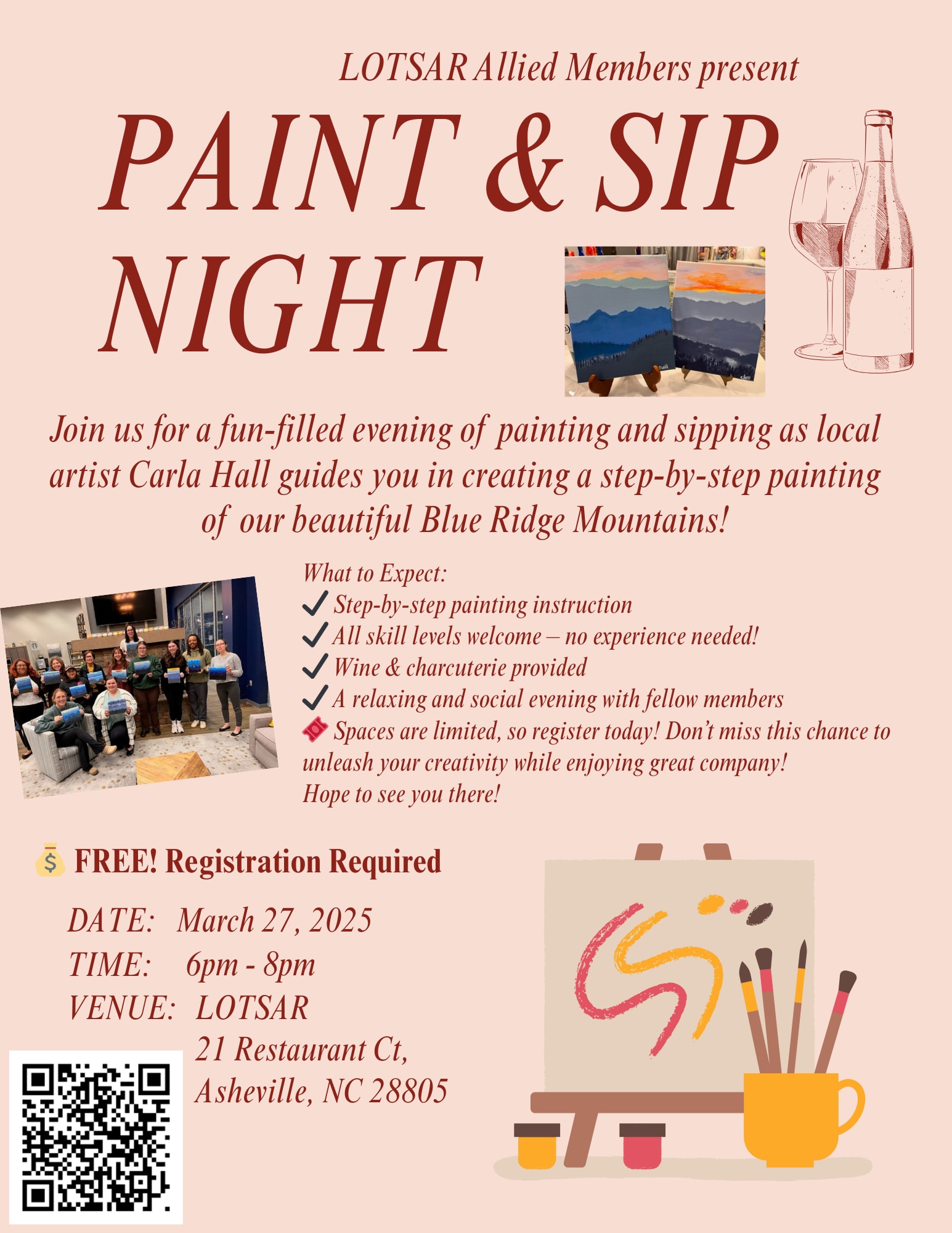 Join us for a fun-filled evening of painting and sipping as local artist Carla Hall guides you in creating a step-by-step painting of our beautiful Blue Ridge Mountains!